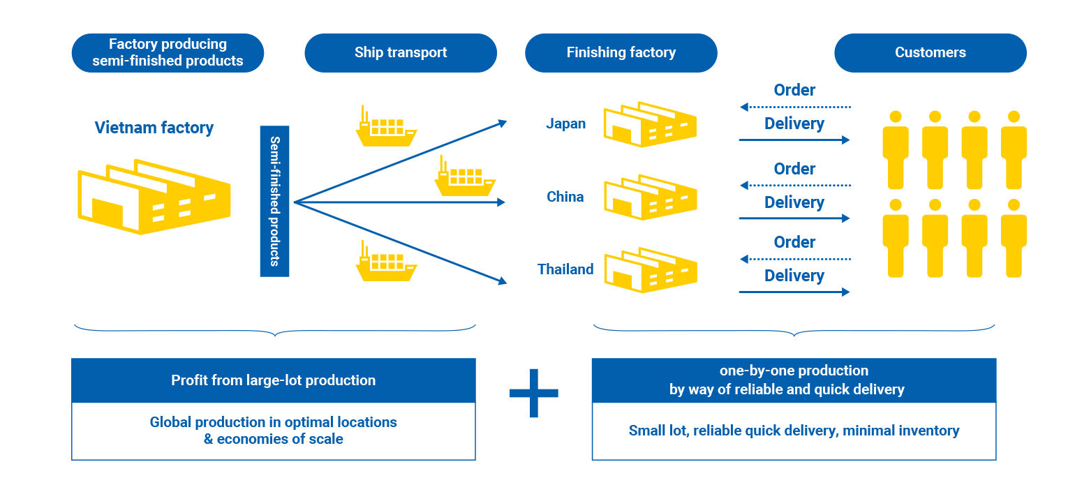 迄今為止,由于每種產品具有不同的分銷渠道以及涉及多個批發商的多層分銷,因此在日本的生產基地采購生產材料的成本很高,交貨時間也很長。