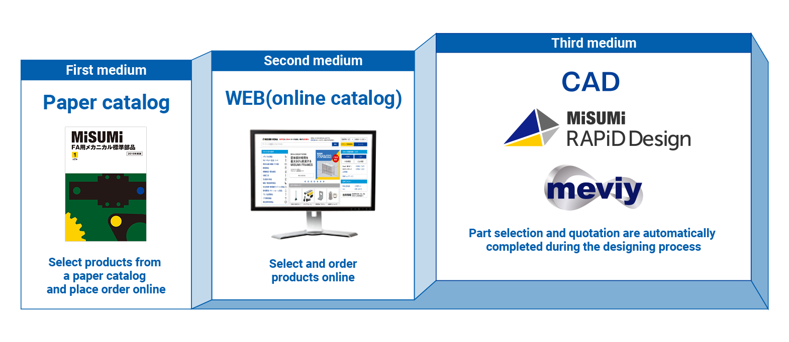 根據紙質目錄和在線目錄,將設備設計師使用的CAD定位為第三種介質,軟件應用程序服務“ RAPiD Design”可幫助加快設計過程,創新的制造平臺“ meviy”可實現自動選擇和報價使用3D CAD數據自動提供零件數量。