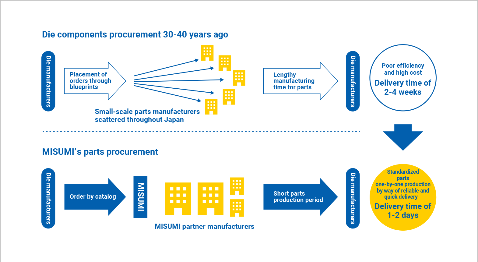 使用MISUMI的在線目錄和紙張目錄,只需指定零件編號和尺寸即可訂購產品。過去,客戶必須為每個零件制定藍圖,從各種各樣的零件制造商那里選擇和訂購各個零件,并分別協商交貨日期和價格,這是一個效率低下的過程。