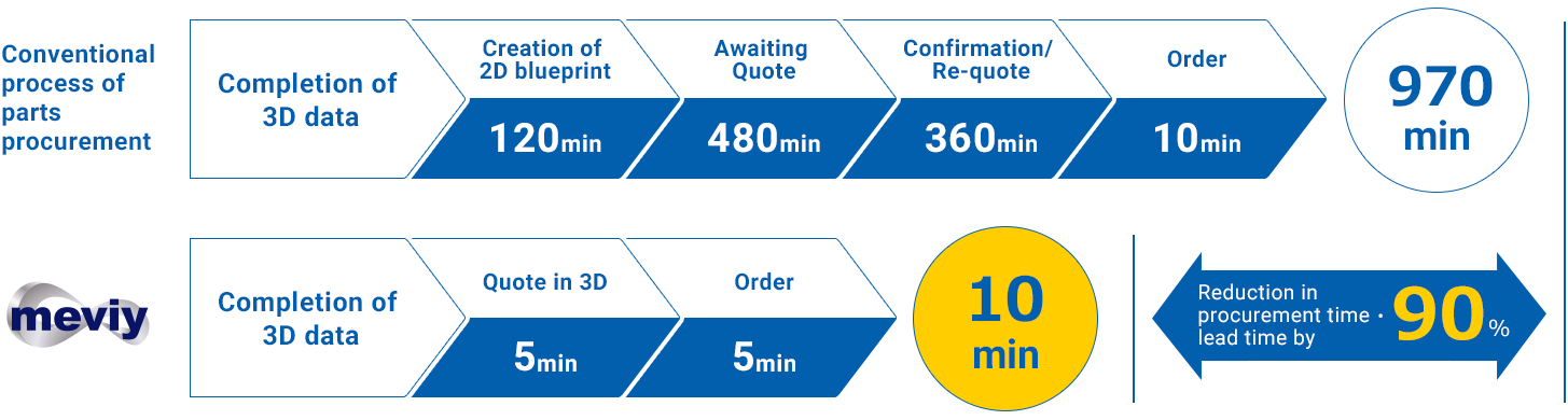 過去,即使在使用3D CAD進行設計時,效率低下仍然存在,因為僅為了獲得報價就需要準備2D藍圖。借助“ meviy”,只需將3D CAD上傳到網站上,就可以立即收到報價,從而大大減少了報價和下訂單的時間。