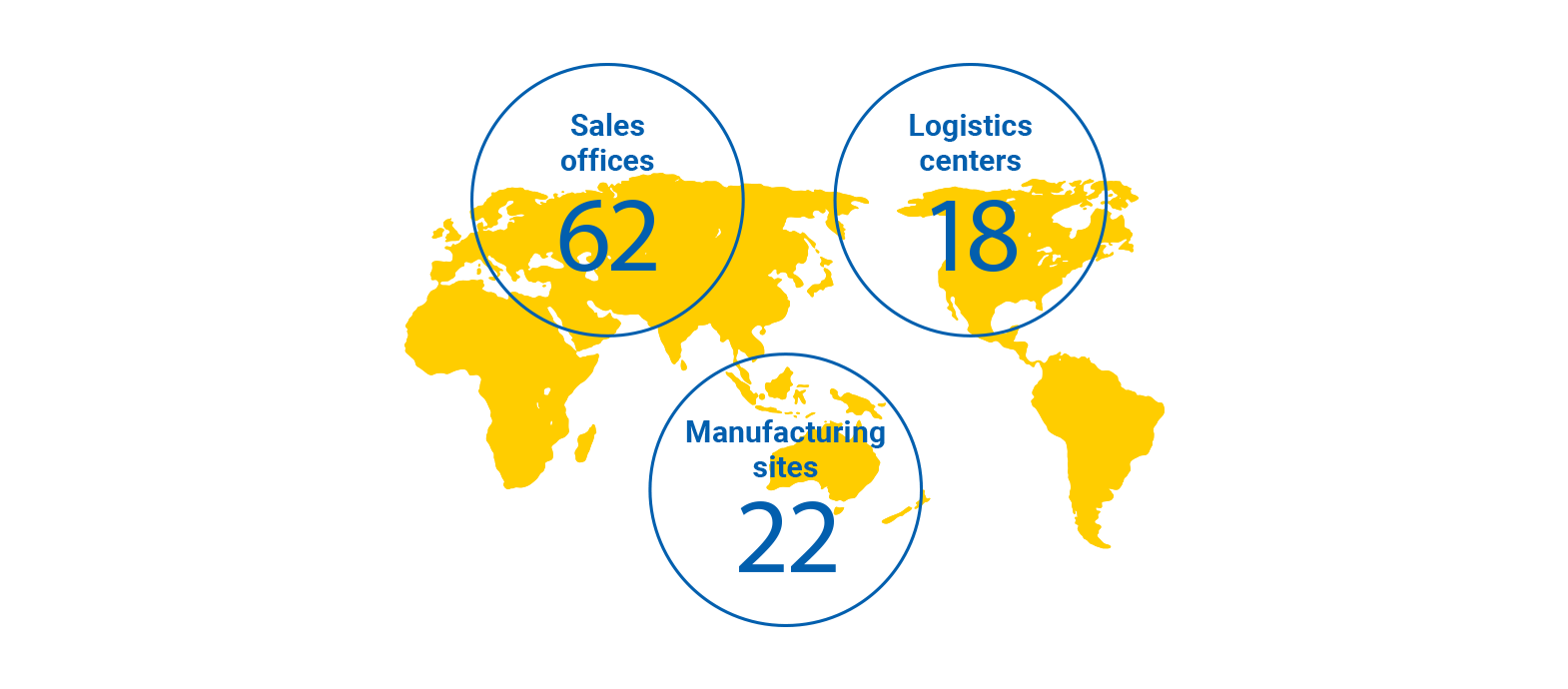 目前,我們的全球網絡包括62個銷售辦事處,18個物流站點和22個制造站點,主要分布在亞洲,北美和歐洲。在全球310,000個客戶中,超過60%的客戶來自海外客戶,并發展成為全球公司。