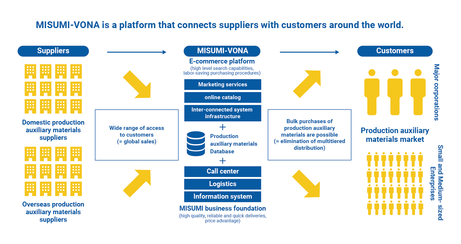 因此,MISUMI于2010年啟動了VONA業務,作為連接客戶和供應商的平臺。通過建立一個可以與供應商直接交易的網絡,傳統的多層分銷就被解散了。客戶現在可以在一站式的基礎上有效地實現生產材料的采購,這是低成本和可靠的快速交付。