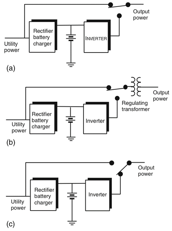 圖 2???? UPS 類型 (a) 備用、(b) 在線互動和 (c) 連續(xù)。