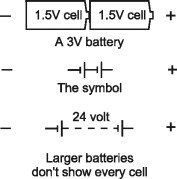 由化學物質產生電壓的單個單元稱為“電池”。如果我們想要更高的電壓,我們必須串聯(lián)電池,然后我們有一組電池或“電池組”,我們現(xiàn)在簡稱為“電池”。因此,嚴格來說,在購買時,我們不應該要求 1.5 V 電池,而是要求 1.5 V 電池,但這往往會造成比其價值更多的混亂(見圖 12.11)。