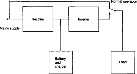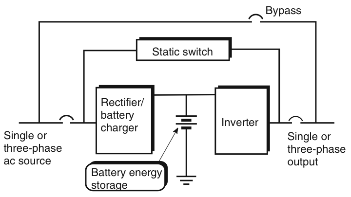 對于在線系統(tǒng),整流器-逆變器組合在正常運行期間從交流電源提供負載電源。如果主電源出現(xiàn)故障,電池會自動向逆變器提供直流鏈路,并且不涉及時間延遲。如果整流器-逆變器系統(tǒng)出現(xiàn)故障,可以使用轉換開關將負載轉移到交流電源。