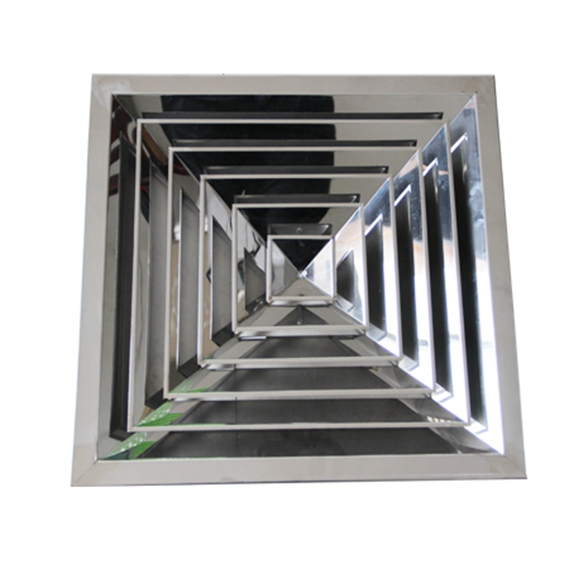 方形散流器為不銹鋼制做,表面經(jīng)過不銹鋼拋光處理。也可按用戶要求進(jìn)行烤漆或靜電噴塑,顏色按用戶選擇。還可以按用戶要求配上調(diào)節(jié)閥或過濾網(wǎng)。方形散流器有四面吹,三面吹,二面吹等幾種出風(fēng)形式。三面吹散流器適于安裝在靠墻較近的天花板上,二面吹散流器適于安裝在墻角附近的天花板上,用戶可根據(jù)安裝位置選用不同出風(fēng)方向的散流器。
