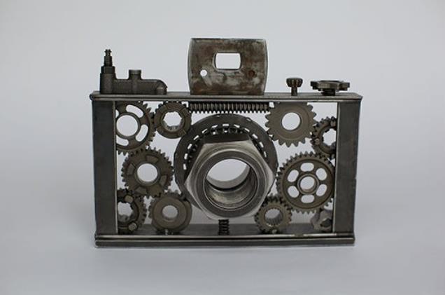 Garage 54使用廢鋼(除其他材料外)制作小型抽象雕塑,對(duì)原始材料的改動(dòng)最小。每個(gè)雕塑都是獨(dú)特的創(chuàng)作,有些是有用的,有些是純粹的美學(xué)。而最令人喜歡的是一款完全由鋼制齒槽、螺母和鐵條制成的相機(jī)。