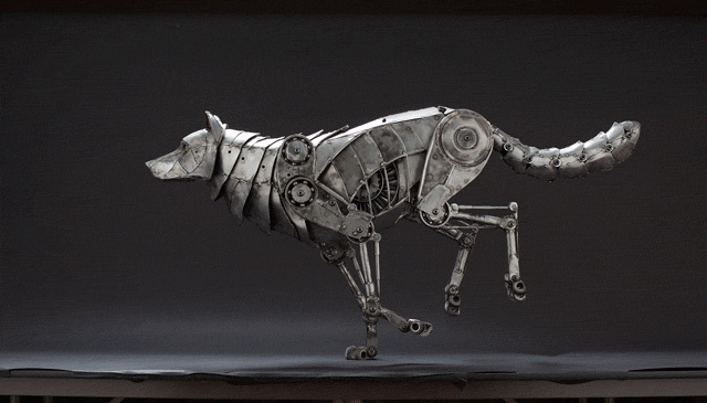 安德魯·蔡斯是一位才華橫溢的攝影師和雕塑家,他從板材到車輪的各種回收鋼零件制作動(dòng)物雕塑。下面的狼只是其中的一個(gè)系列,其中也包括大象, 獵豹和霸王龍。