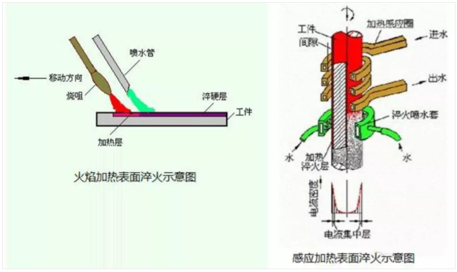 表面淬火的主要方法有火焰淬火和感應加熱,常用的熱源有氧乙炔或氧丙烷等火焰等。
