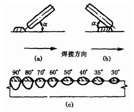(2)電極(焊絲)傾角焊接時(shí),電極(焊絲)相對于焊接方向可以傾斜一個角度。當(dāng)電極(焊絲)的傾角順著焊接方向時(shí)叫后傾;逆著焊接方向時(shí)叫前傾,見圖1—32(a)、(b)。電極(焊絲)前傾時(shí),電弧力對熔池液體金屬后排作用減弱,熔池底部液體金屬增厚了,阻礙了電弧對熔池底部母材的加熱,故焊縫厚度減小。同時(shí),電弧對熔池前部未熔化母材預(yù)熱作用加強(qiáng),因此焊縫寬度增加,余高減小,前傾角度。愈小,這一影響愈明顯,見圖1—32(c)。