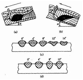 (a)下坡焊??(b)上坡焊??(c)下坡焊時(shí)焊件傾角的影響 (d)上坡焊時(shí)焊件傾角的影響
