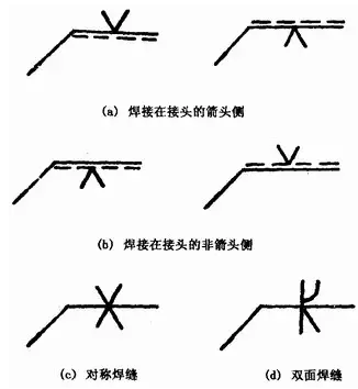 基本符號相對基準(zhǔn)線的位置見圖1—27(a)、(b)、(c)、(d);標(biāo)注對稱焊縫及雙面焊縫時(shí),不加虛線。