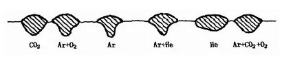 (6)保護(hù)氣體成分??氣體保護(hù)焊時(shí),保護(hù)氣體的成分以及與此密切相關(guān)的熔滴過渡形式對焊縫形狀有明顯影響。采用不同保護(hù)氣體進(jìn)行熔化極氣體保護(hù)焊直流反接時(shí),焊縫形狀的變化,見圖1—35。射流過渡氬弧焊總是形成明顯蘑菇狀焊縫,氬氣中加入O2、CO2或H2時(shí),可使根部成形展寬,焊縫厚度略有增加。顆粒狀和短路過渡電弧焊則形成的焊縫形狀寬而淺。