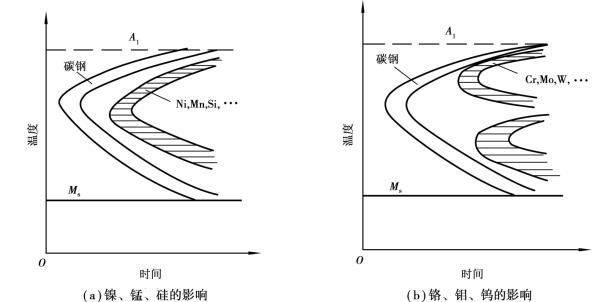②提高淬透性 除鈷以外,大多數合金元素溶入奧氏體后均能增加過冷奧氏體的穩定性,使C曲線右移,降低了馬氏體轉變的臨界冷卻速度,從而提高鋼的淬透性。提高鋼淬透性的元素主要有鉻、錳、硅、鎳、硼。其中有些合金元素甚至使C曲線的形狀發生變化,出現了兩個鼻尖,如圖1.5.2所示。