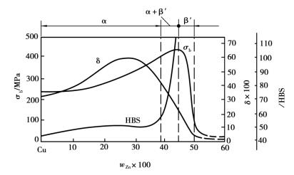 圖1.5.7 黃銅的力學(xué)性能與鋅的質(zhì)量分?jǐn)?shù)的關(guān)系