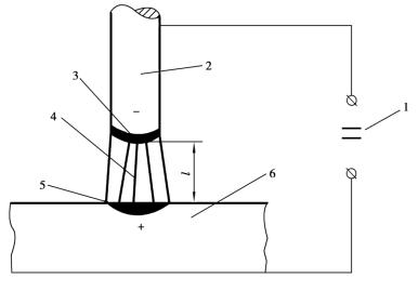 1—電源(直流) 2—焊條 3—陰極區(qū)4—弧柱 5—陽極區(qū) 6—工件