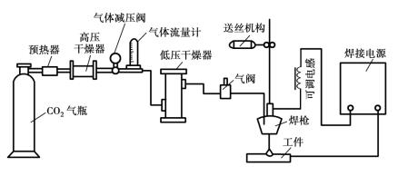 CO2焊接設備的組成如圖4.1.8所示。一般情況下,無須接干燥器,甚至預熱器也可不要。但用于300 A以上的焊槍需用水冷卻。