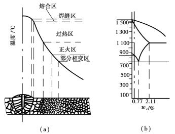 熱影響區(qū)各點(diǎn)的最高加熱溫度不同。因此,其組織變化也不相同。圖4.2.1為低碳鋼焊接接頭的組織變化。左圖為焊接接頭各點(diǎn)最高加熱溫度曲線,右圖為簡化的碳鋼相圖。低碳鋼的熱影響區(qū)可分為過熱區(qū)、正火區(qū)和部分相變區(qū)。