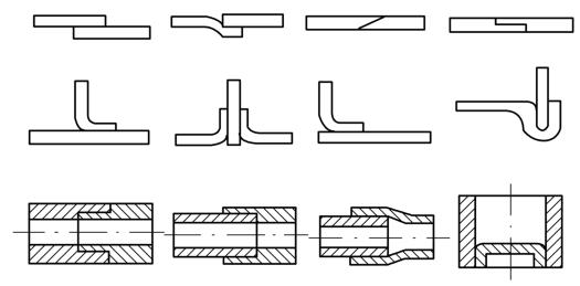 但釬焊的接頭強度較低,尤其動載強度低。釬焊構件的接頭形式都采用板料搭接和套件鑲接,如圖4.3.3所示。這些接頭都有較大的釬接面,以彌補釬料強度的不足。