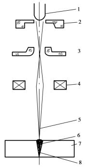 電子束焊接的定義 2019-07-0510:39:01電子束焊接的定義已關(guān)閉評論電子束焊接方法(圖4.3.5)屬于高能密度焊接方法。其特點是焊接時的能量密度大,可以焊出寬度小、深度大的焊縫,熱影響區(qū)以及焊接變形很小。電子束焊在真空中進(jìn)行,焊縫受到充分保護(hù),能保證焊縫金屬的高純度。電子束焊以前多用于航空航天、核工業(yè)等部門,焊接活性材料及難熔材料。現(xiàn)已應(yīng)用在汽車制造、工具制造等工業(yè),如焊接汽車大梁及雙金屬鋸條等。圖4.3.5 電子束焊原理1—陰極 2—控制板 3—陽極4—電磁透鏡 5—電子束6—聚焦束 7—工件 8—焊縫 贊 0 分享