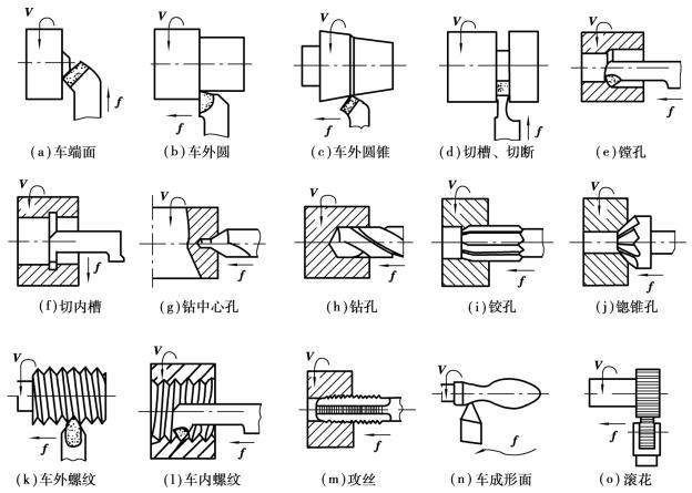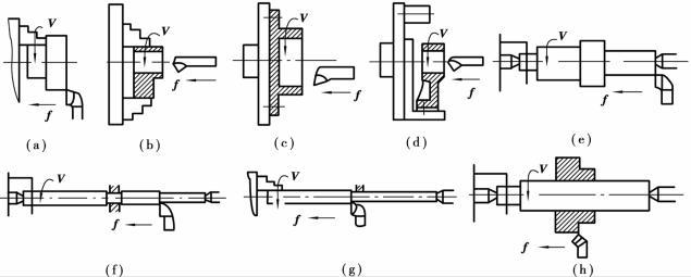 車削加工可以在普通車床、立式車床、轉塔車床、仿形車床、自動車床以及各種專用車床上進行。車削能加工的表面有:端面、內外圓柱面、內外圓錐面、螺紋面、回轉成形面、回轉溝槽以及滾花等,如圖5.2.1所示。