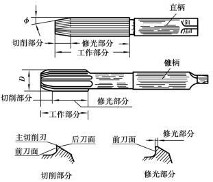 如圖5.2.32所示。手鉸刀為直柄,直徑范圍為φ1~φ50,其工作部分較長,半錐角φ角較小,導向作用較好,可防止手工鉸孔時鉸刀歪斜。機鉸刀多為錐柄,直徑范圍為φ10~φ80,可安裝在鉆床、車床、銑床和鏜床上進行鉸孔。