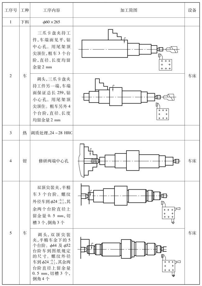 定位精基準中心孔應在粗車之前加工,在調質之后和磨削之前各需安排一次修研中心孔工序。前者為消除中心孔的熱處理變形和氧化皮;后者為提高定位精基準的精度和減小表面粗糙度。擬訂零件的工藝過程時,在考慮主要表面加工的同時,還要考慮次要表面的加工。半精車階段,外圓φ52達到圖紙規定的尺寸,同時加工出各退刀槽、倒角和螺紋;3個鍵槽應在磨削之前銑出。