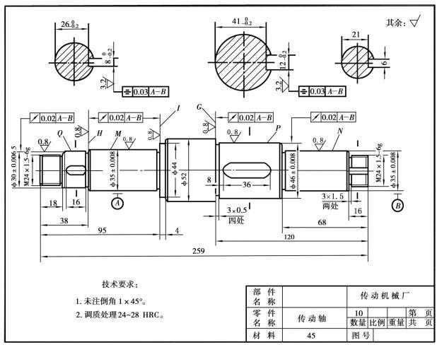 傳動軸大都是回轉表面,應車削成形。由于該軸的主要表面M,N,P,Q的精度等級較高(IT6)、粗糙度較低(R a= 0.8),車削后還需進行磨削。這些表面的加工順序應該是:粗車—半精車—磨削。